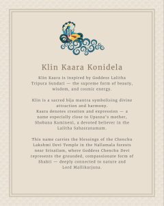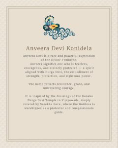 அன்வீரா தேவி – தெய்வீக பெண்மை (Divine Feminine) யை பிரதிபலிக்கும் அபூர்வமும் வலிமையும் கொண்ட வெளிப்பாடு. அன்வீரா என்பது அஞ்சாமை, திடத்தன்மை மற்றும் தெய்வீக பாதுகாப்பைக் குறிக்கிறது; கனக துர்கா தேவியின் அருளால் உதித்த பெயர். அருள், துணிச்சல் மற்றும் நிலையான வலிமையை பிரதிபலிக்கும் பெயர்.