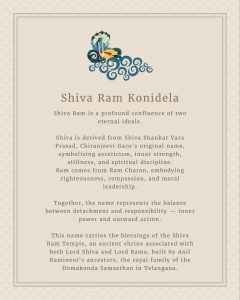 சிவராம் – இரண்டு நிரந்தரமான இலட்சியங்களின் ஆழமான சங்கமம். ‘சிவ’ என்பது சிவ சங்கர வர பிரசாத் அவர்களிடமிருந்து உதித்த, உள்ளார்ந்த வலிமை, ஆன்மிக ஆழம் மற்றும் அமைதியை பிரதிபலிக்கிறது. ‘ராம்’ என்பது ராம் சரணிடமிருந்து வந்தது; நீதிமுறை, கருணை மற்றும் ஒழுக்கத் துணிச்சலை குறிக்கிறது.